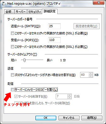 2.「サーバーにメッセージのコピーを置く」のチェックを外します。