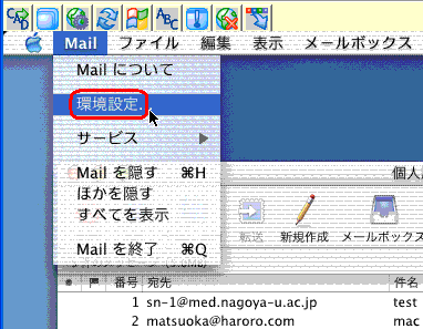 1.[Mail]→[環境設定]を開きます。