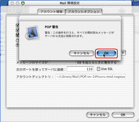 5.「POP警告」のウィンドウで「OK」をクリックします。