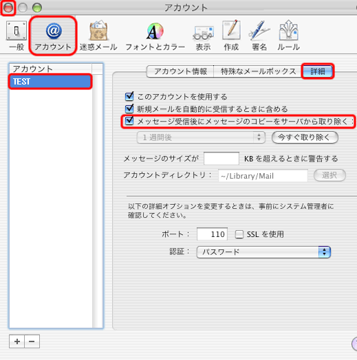 4.「メッセージ受信後にメッセージのコピーをサーバから取り除く」をチェックします。